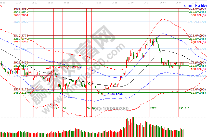 指數連續兩個交易日收盤在贏家江恩系統工具分析的關鍵區2880-2890之間,周一盤中擊破2880后收復,此區間是江恩價格圖表四方形和60分鐘極反通道生命線,運用多周期結合判斷,關鍵位不破保持市場延續反彈的觀點。如受外因不確性因素影響,波段百分比延伸線2834點是強支撐,該位置是近1個多月來箱體震蕩平臺下沿,重要性不言而喻。反彈第一目標位2950位置,第二目標位是日線黑色生命線,在可承受的風險持倉內保持平和的心態應對市場。6月18號盤中壓力是135度2911點、180度2928點,盤中支撐是0度2860、315度2844點。操作策略,指數處于極反通道弱勢區域的反彈走勢,繼續關注2880-2890區間得失,整體持倉保持3-5成。
