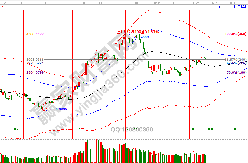 2號午盤在贏家江恩系統學員區及當日收盤分析中,講述了通過極反通道判斷出的短周期周期共振警示信號,所提出結論目前正在一步步得到市場的確認,逐級回踩生命線,這也是近兩日一直談到不讓開新倉的技術依據,短期警示信號是結束還是展開新的周期修整,將于今天見分曉。整體上2840附近所展開的反彈還沒有結束,短線具有參考價值就是60分鐘的生命線位置。,7月5號盤中壓力是45度3016點、90度3036點,盤中支撐是315度2978點,下個時間窗口是15號。操作策略,指數極反通道生命線上安全區域震蕩上攻,反彈動作還未結束,短線關注2978-2983位置,整體持倉保持3-5成。