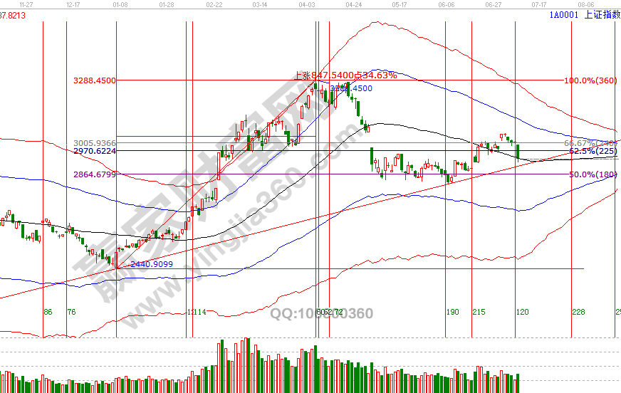 2號贏家江恩系統極反通道短周期發出警示信號,一直到5號午盤重新解讀,按系統規則,指數按預期回探至60分鐘生命線,并提出未來走勢一種是周期共振警示解除,一種是進入新的修整周期,指數今日早盤快速擊穿60分鐘生命線,并帶動日線級別擊破,則代表進入新修整周期,10號、15號時間窗口關注指數與生命線關系,預計近日在生命線下附近修整后會有一次對快速下跌的反彈,具體空間點位上,江恩價格四方形、波段百分比延伸線顯示2894、2878為強支撐,贏家學員可以動態參考60分鐘藍色下軌線。操作策略,指數回踩至極反通道生命線處,2822反彈動作還未明確結束,未來一段時間都會整體持倉保持3成左右。