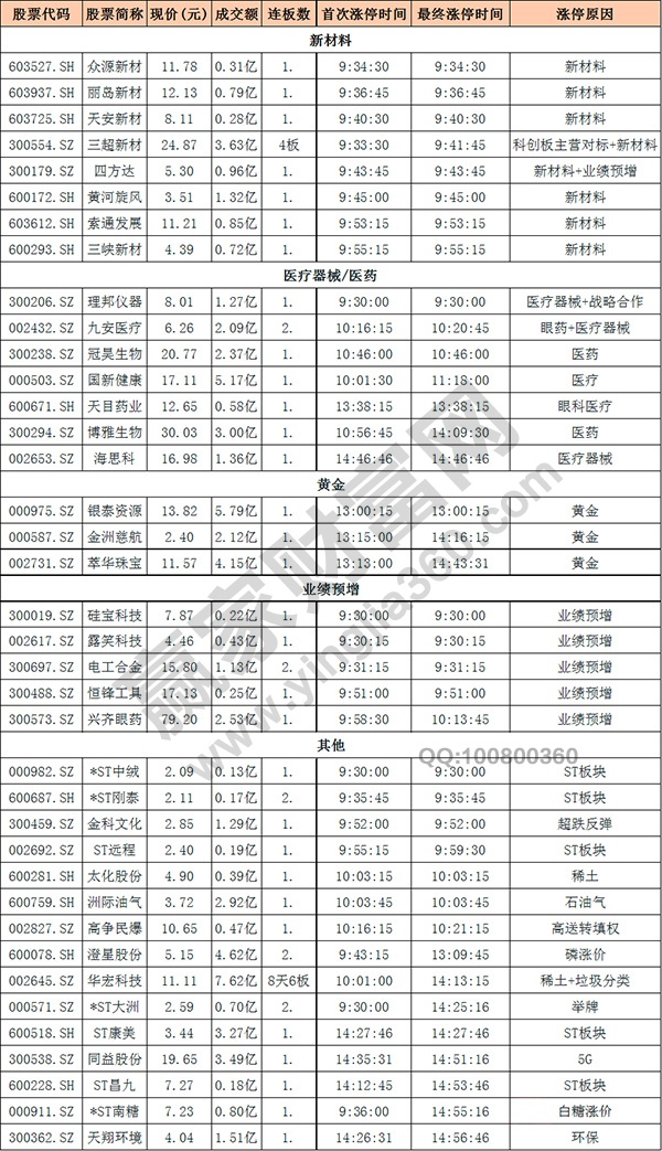 新材料、醫療器械 封板效率:一般