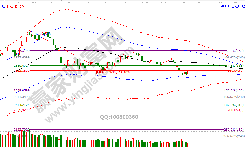 指數(shù)自6號觸及極反通道藍(lán)色下軌線2744點(diǎn)獲得支撐后展開反抽已有5個(gè)交易日,按時(shí)價(jià)等倍關(guān)系測算空間運(yùn)行不足一半,從這一點(diǎn)說明市場反抽力量之弱。短周期15分鐘藍(lán)色上軌線是2823點(diǎn)(缺口位置是2822點(diǎn)),指數(shù)越向上運(yùn)行遇到反壓級別越大,日線波段百分比延伸線180度是2834點(diǎn),這也是6號測算的2744點(diǎn)、2834點(diǎn)兩個(gè)關(guān)鍵位,反抽時(shí)間還沒有結(jié)束,震蕩不改反抽目標(biāo)位。8月13號盤中壓力是270度2829點(diǎn),盤中支撐是180度2800點(diǎn)、2791點(diǎn),日線時(shí)間窗口是16號。操作策略,指數(shù)生命線下弱勢區(qū)運(yùn)行,激進(jìn)者3成倉交易,穩(wěn)健者空倉休息。