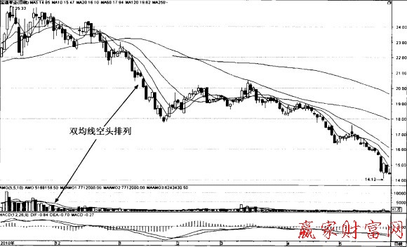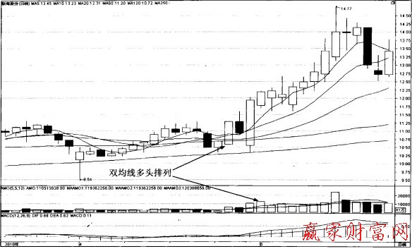 一是均價(jià)線在上升,而均量線卻走平或下降。比如在上漲行情的未期,往往股價(jià)仍創(chuàng)新高,均價(jià)線繼續(xù)向上運(yùn)行,但均量線卻開始走平或拐頭向下,出現(xiàn)頂背離現(xiàn)象。這種情況表明買盤減少,雖然移動平均線仍呈多頭排列,可以繼續(xù)做多,但無疑應(yīng)該多加幾分小心,替惕變盤的發(fā)生。