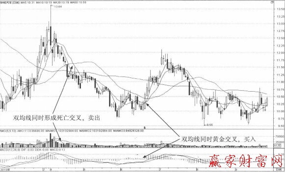 當(dāng)均價(jià)線和均量線同時上翹,并形成黃金交叉時,說明市場已經(jīng)轉(zhuǎn)入強(qiáng)勢行情,應(yīng)當(dāng)買入。反之,當(dāng)均價(jià)線和均量線同時向下運(yùn)行,并形成死亡交叉時,說明市場已經(jīng)轉(zhuǎn)弱,應(yīng)該賣出,例如下圖中所展示的。