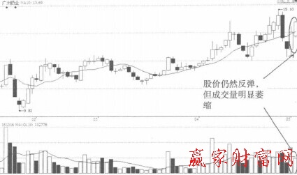 如圖1所示,在廣州藥業的日K線中,股價在見頂15.10元的過程中,在圖中所示的位置終于跌破了10日均線的支撐。而股價雖然連漲兩天,但終究沒有使成交量放大多少。投資者不僅不宜追漲,還要仔細觀察股價是否有繼續見頂回落的走勢。若該股形成了雙頭見頂回落的走勢,顯然就是出貨的時機了。