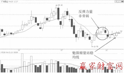 如圖3所示,該股在圖中所示的持續下跌過程中,不久就出現了縮量小幅反彈至10日均線現象。既然前期10日均線的壓制作用已經被確認了,那么圖中的小幅反彈行情就不會向上突破10日均線,投資者可以只把股價反彈至10日均線的機會當做出貨時機。該股有望在見頂10日均線之后,不斷地創出新低。