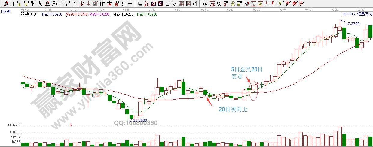 首先介紹一下520戰法。520這套戰法是兩條均線的組合,是選擇一條短期5日均線和一條20均線參數組合。問題來了,為何選取5和20均線呢?因為5日均線又叫“攻擊線”5日均線波動較快,更貼近股價的走勢,所以,在信號上更加迅速。5日之上的個股本身就比較強勢。例如下面的恒逸石化走勢圖。
