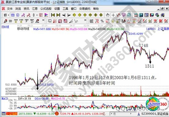 打開上海大盤,我們發現小周期循環為0.5年,其它周期循環是小周期循環的N倍。這樣我們就以117日均線作為小周期循環0.5的均線。這種設法在實戰中會怎么樣的?如上圖所示,我們將1996年1月低點512作為大3浪的開始點,已經有8年之久,大盤會不會受到8.5年均線支撐呢?在2003年1月6日上證大盤下跌到1311點,準確無誤落在8.5年均線之上,而且當時這個8.5年均線也是1311,大家可以調出相應的均線進行觀察。
