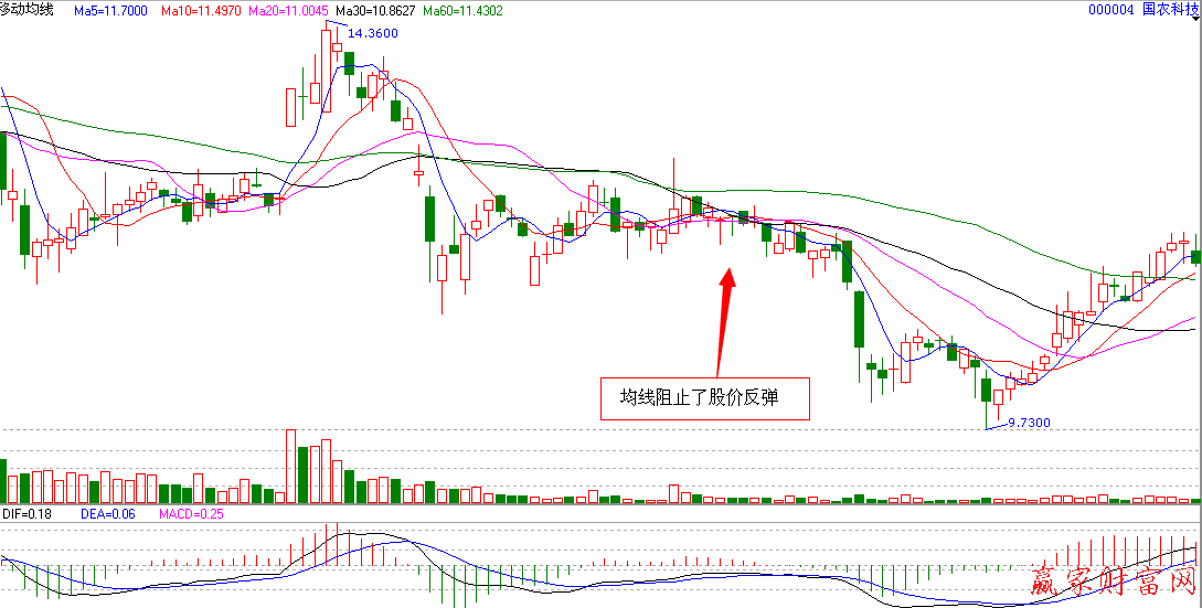 下圖為000004國農科技的日K線圖,該圖選用的時間周期為每日,因此兼顧了短期和中期移動平均線的走勢,從圖中我們可以看出,股價在箭頭所指位置受均線阻止結束了短期的反彈走勢,其成交量也沒有明顯變化,因此投資者在此時應該賣出股票,獲利出場。