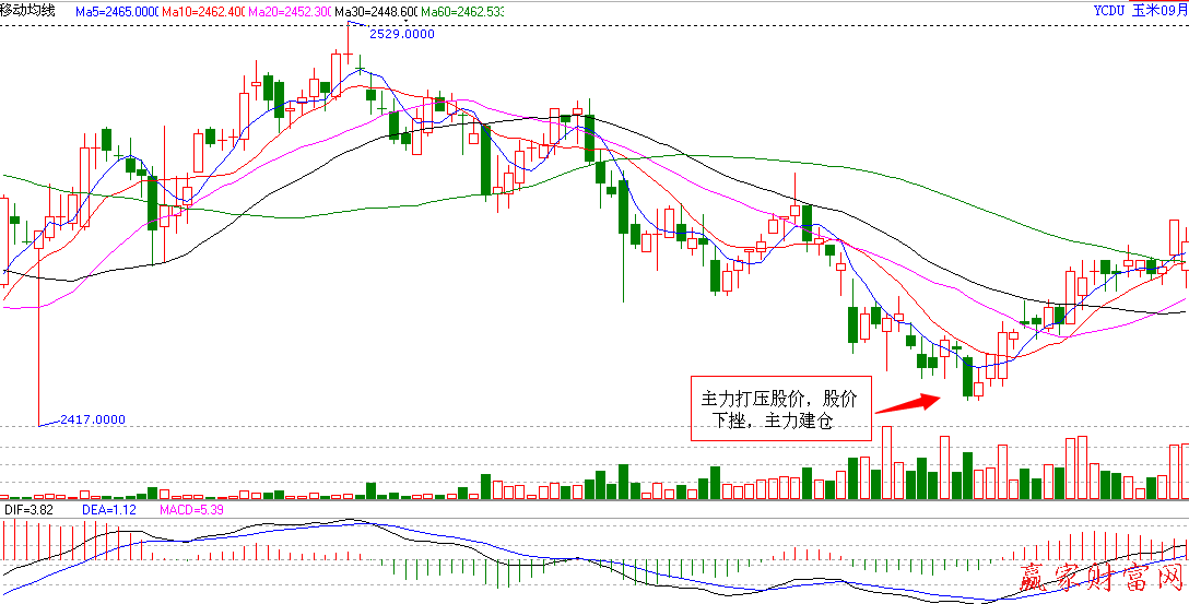 如圖為YCDU玉米09月日K線圖,股價2529.0000元高位開始下行,至箭頭所指位置達(dá)到最低價位,然而主力機構(gòu)在股價達(dá)到最低之前,陰K線的實體已經(jīng)有所減小,這說明已經(jīng)有做多的能量進(jìn)場阻止價格大幅下跌,這就是主力建倉的標(biāo)志。