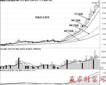 上圖為明星電力日K線圖。從圖中我們可以看出當(dāng)股價的5日均線、10均線、30日均線和60日均線系統(tǒng)構(gòu)成多頭排列后,不論短期、中期還是長期投資者都看好該股,所以買方將股價連續(xù)推高。