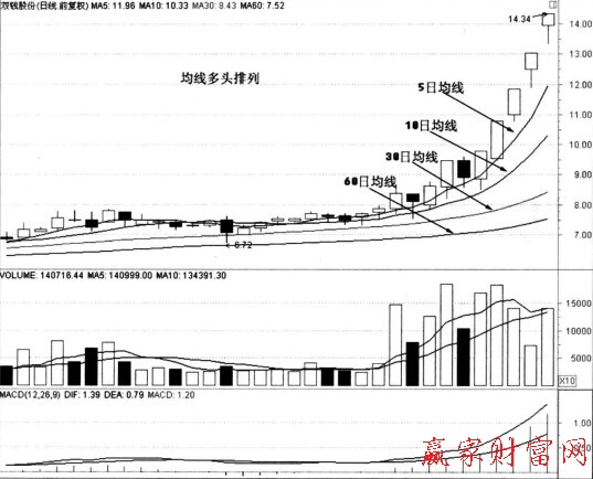 在均線多頭排列初期,及時地介入中線成長價值牛股,會獲得極大的收益!利用均線多頭排列選股成功率比較高,但要注意千萬別選漲到末端、漲到頭的個股,注意其漲幅以及莊家是否還在其中。