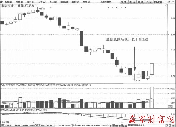 在長期下跌后,做空動能得到有效釋放,長上影K線的出現,從K線形態上發出了直觀的警示性見底信號。由于股價可以憑借自身重力下降,故該信號出現時,投資者要等待次日高開高走的陽線確認。