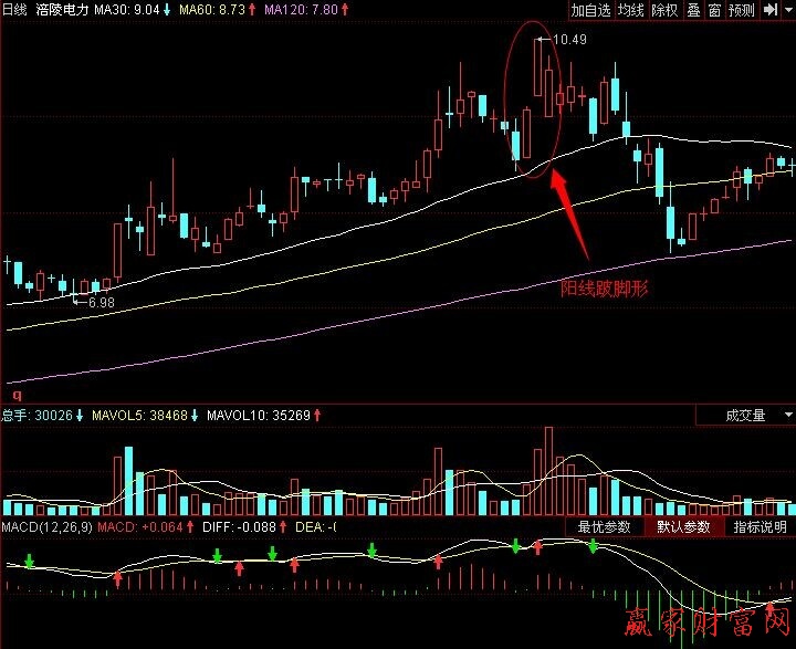 如圖顯示的是2009年6月3日到2009年9月24日的涪陵電力(600452)的日K線圖。涪陵電力的股價經(jīng)過不斷拉升后,出現(xiàn)了陽線跋腳形K線組合,暗示著上檔拋壓沉重,是一個賣出信號,投資者見此K線圖,應(yīng)及時賣出手中的股票,離場觀望。