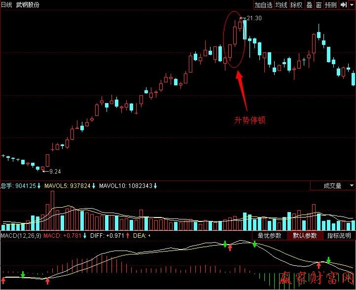 如圖顯示的是2007年7月13日到2007年10月10日的武鋼股份(600005)的日K線圖。武鋼股份的股價經(jīng)過多次拉升后,拉高到21.30元,接著出現(xiàn)了升勢停頓,幾線組合,表明做多的后續(xù)力最己經(jīng)跟不上,股價隨時會出現(xiàn)回落。投資者見到該K線組合,要保持等惕,及時清倉離場。