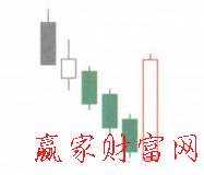 2.第四天,股價低開高走收大陽線,且大陽線的收盤價突破了第一天的開盤價,將前三報陰線全部吞噬。