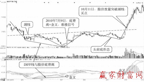 因此,當DIFF線與股價底背離出現(xiàn)后,此時雖然底背離形態(tài)還沒有最終形成,但由于上漲動能強烈,激進型的投資者即可伺機買入;之后,如果頭肩底形態(tài)徹底形成,投資者可以等股價突破頸線時積極買入。