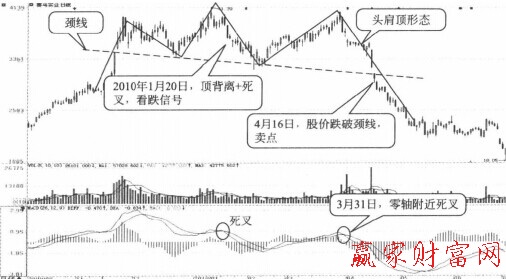 ① MACD指標"DIFF線與股價頂背離十死叉”出現(xiàn)后,股價一般都出現(xiàn)一波下跌走勢,但走勢能否徹底反轉(zhuǎn)還不一定。而頭肩頂形態(tài)的逐步形成,將鎖定“徹底反轉(zhuǎn)”的可能性。因此,在股價跌破頸線時,投資者要注意果斷出場。