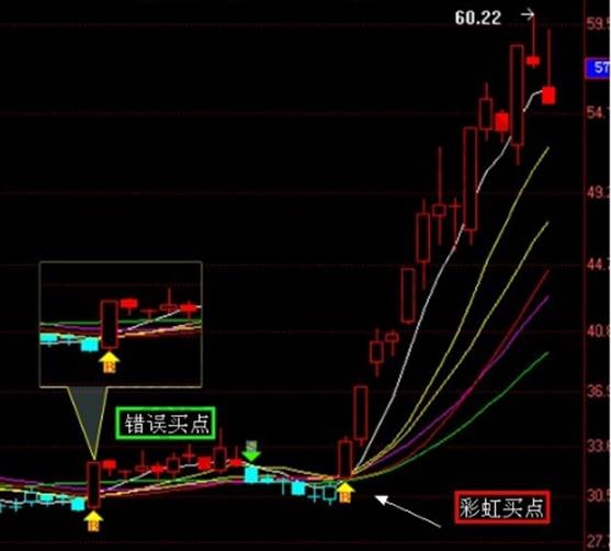 圖中正確的彩虹買點是右側標注的彩虹買點,彩虹線的特征每次發散后的符合會越來越近,當彩虹線粘合越近后期的暴發力度會越大,左側錯誤買點原因就是多線沒有粘合徹底,這個時候的買點后期力度小,而右側達到最佳位置整理,一旦發出買點便可以大單的建倉買入。