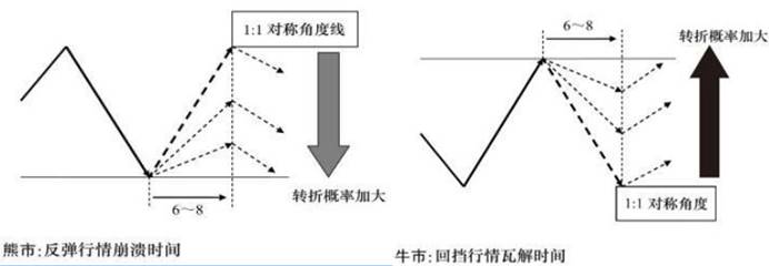 在進(jìn)行逆勢(shì)計(jì)算行情的崩潰時(shí)機(jī)的時(shí)候,角度時(shí)間模型是非常重要的,這也是行情分析的關(guān)鍵所在。下面的兩張圖形顯示的就是這兩種角度時(shí)間模型是有針對(duì)性的,如果用錯(cuò)了牛熊黃精,那么我們就得不償失了,這一點(diǎn)大家一定要注意。