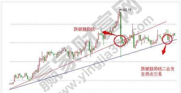 這種方法有兩種情況,一種是上漲過程中,可以將相鄰的兩個低點連接,形成趨勢線,如果過快上漲,乖離率變化,那么回調的幾率會出現,這時候,價格可能跌破我們畫的趨勢線。如果說多頭動能再次向上反彈,沒有衰竭,那么就是震蕩行情,可能形成趨勢線二。