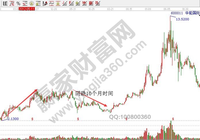 連續(xù)陰跌既然是洗盤,那么本質都是利用較為少量的籌碼達到洗籌的目的,整體趨勢來說是在底部有明顯的進倉過程,在頂部沒有高位放量,后市還是拉高的走勢。這類個股上一般來說盤子都比較大,長久的不活躍也會被認為是正常,受到炒作的機會較少。并且這種個股在第一波漲勢中的漲幅并不大,在連續(xù)陰跌之后前面的上漲趨勢已經不再受到關注,股價繼續(xù)下跌,投資賣出的意愿不強,而沒有出現上漲苗頭,賣盤也不多,持續(xù)的縮量陰跌的格局就會持續(xù)。比如下圖股票的走勢圖就是如此。
